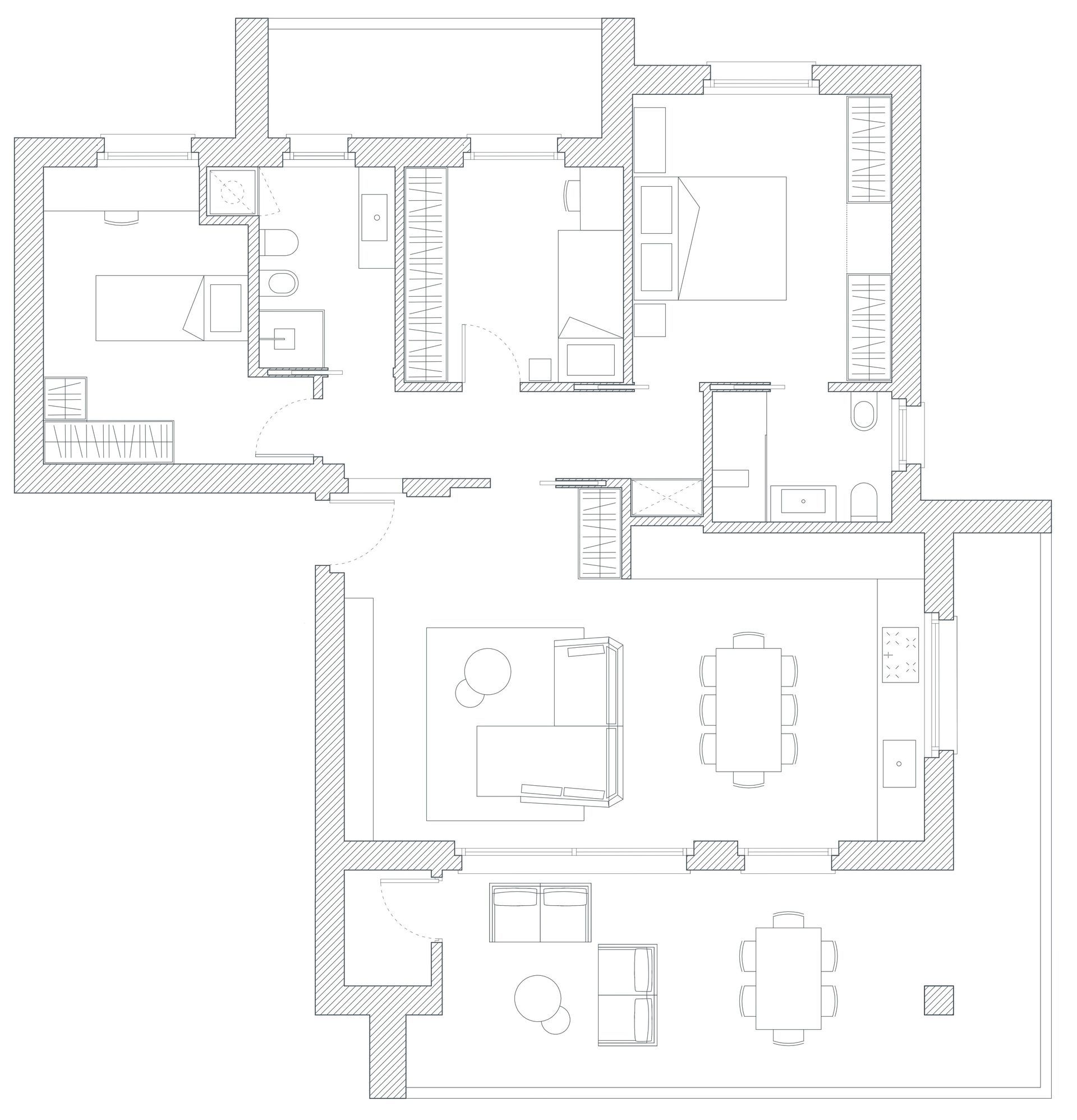 Questo progetto è decisamente sui generis: non nasce, infatti, da una ristrutturazione di un appartamento esistente, ma siamo intervenute sulla carta a modificare il layout di un appartamento di un immobile in fase di costruzione.